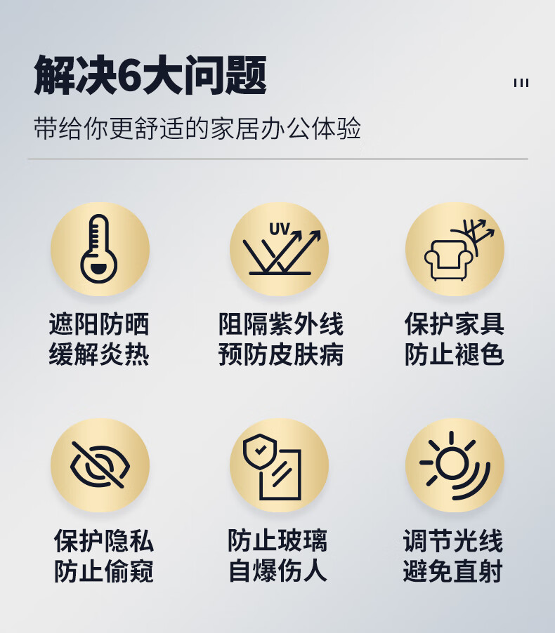 阻隔夏季熱量,使室內環境更舒適高隔熱、高透光、降低空調和照明的運營費用,使您擁有更節能舒適的環境非金屬鍍膜:擁有多項3M專利技術,無褪色氧化困擾、無腐蝕、無電子信號干擾低內外反射率,消除鏡面效應保證視野清晰具有獨特紫外線隔斷層設計,抗紫外線率達99%,大大減少家具織物的褪色,延長其使用壽命高透光、高隔熱,無全屬涂層,使用壽命超長。